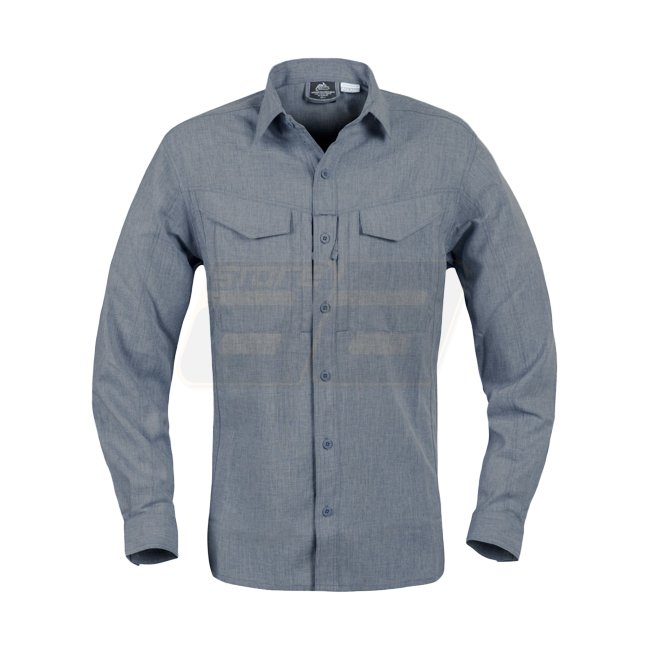 Das Helikon-Tex Defender Mk2 Gentleman Hemd in Melange Blau, Größe XS, ist ein leichtes und elastisches Kleidungsstück aus Nylon und Polyester. Es bietet schnelltrocknende Eigenschaften und UPF30 UV-Schutz, was es atmungsaktiv und angenehm zu tragen macht