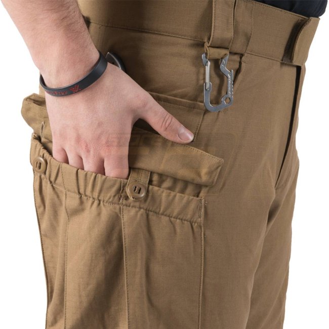 Die Hose hat einen lockeren, profilierten Schnitt. Der Gürtel ist mit Klettband befestigt, was eine zusätzliche Feineinstellung ermöglicht. Breite Gürtelschlaufen nehmen Gürtel mit einer Breite von bis zu 45mm auf, auch wenn Holster- oder Magazintaschen installiert sind. Für zusätzliche Bewegungsfreiheit finden sich Einschübe aus elastischem VersaStretch Material auf der Rückseite sowie im Schrittbereich. Klassische Fronttaschen mit Verstärkungen an den Kanten vermeiden eine Beschädigung durch Messerklammern. Zusätzliche Gesäßtaschen mit verstärkten Kanten passen fassen auch größere Gegenstände wie Magazine. An den Oberschenkeln befinden sich große, geräumige Cargotaschen mit Knöpfen. An den Unterschenkeln fassen kleinere geschlossene Taschen mit Klettverschluss wichtige Ausrüstung wie Feldverbände oder ein Tourniquet.