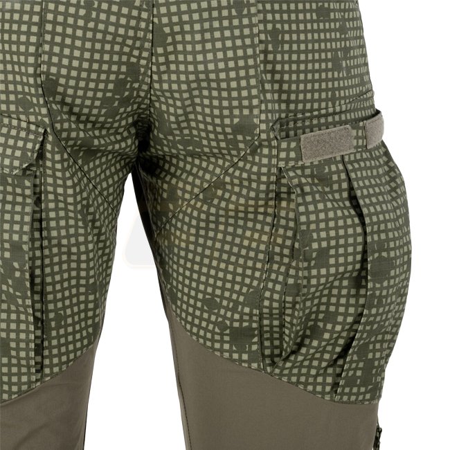 In wichtigen Bereichen (Taille, Schritt und Kniekehlen) wurden Einsätze aus Versastrech-Material verwendet. Es trocknet schnell und ist hoch atmungsaktiv. Der Kniebereich ist mit 500D Cordura-Gewebe mit Schlitzen für Schutzeinsätze verstärkt. Dank zusätzlicher Kordeln, die sich unter dem Knie und am unteren Beinende befinden, lässt sich die Hose leicht an das Bein anpassen.