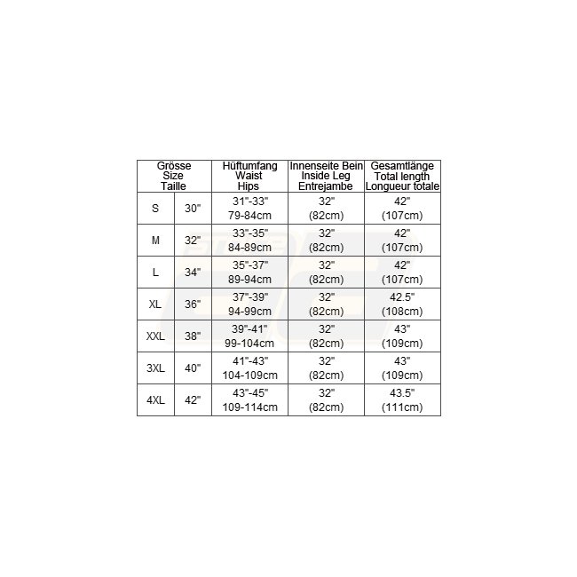 ◦ Vier Oberschenkel Taschen - zwei einfach gefaltete grosse Taschen mit erhöhter Kapazität und YKK® Reissverschluss, bestimmt zum Tragen von Dokumenten und kleinen persönlichen Gegenständen; zwei kleinere Taschen im vorderen Oberschenkel Bereich mit einem Klettverschluss. Diese sind für die Aufnahme von Mobiltelefonen und Magazinen bestimmt
