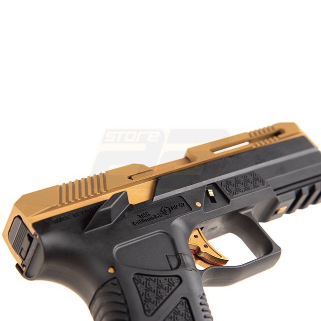 HFC AG-17 Gas Blow Back Pistole - Gold: Metall / Polymer, 26 Schuss, 200 mm lang, 730 g schwer, 98 mm Innenlauf, 290-310 FPS / 0,78-0,89 Joule, halbautomatisch, 39,79-42,53 m Schussreichweite, einstellbarer Hop-Up. Das Paket enthält die Waffe und das Maga