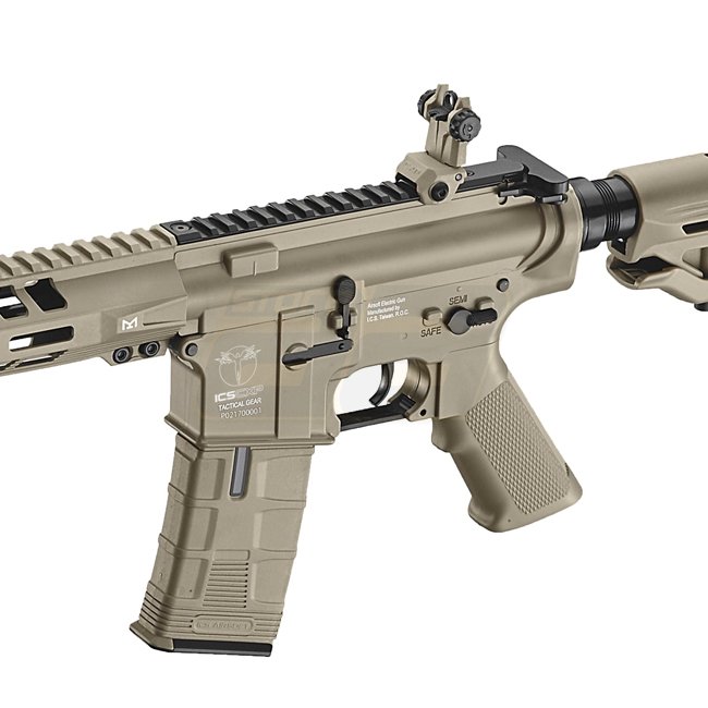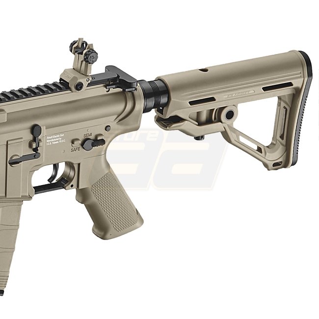 ICS CXP Peleador DMR AEG - Tan ist ein vielseitiges Airsoft-Gewehr mit einem Version 2 Gearbox, MOSFET, Langtypmotor, einer Magazin Kapazität von 300 Schuss und einstellbarem Hop-up. Dieses Polymer/Metall-Gewehr hat eine Länge von 817-894 mm, wiegt 2369 g