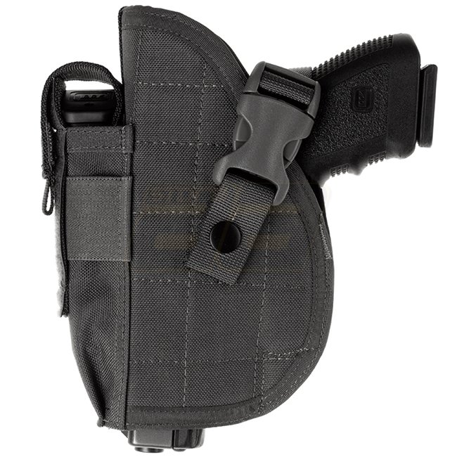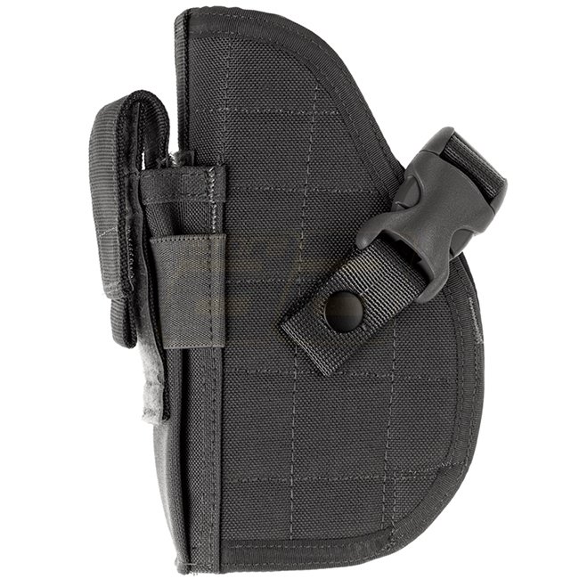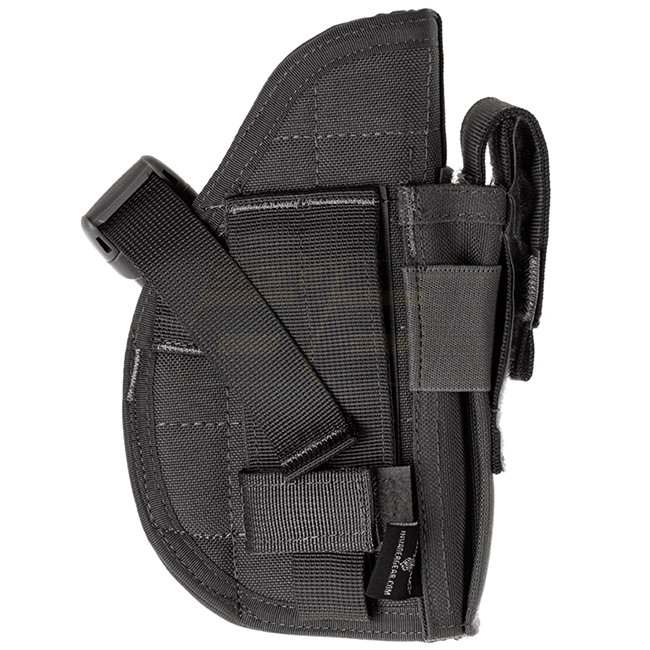 Universalholster für eine Vielzahl von mittelgrossen Pistolen wie z.B. Glock 17 oder Beretta 92. Es ist mit einer integrierten Magazintasche und einem Klett-Gürtelverschluss ausgestattet.