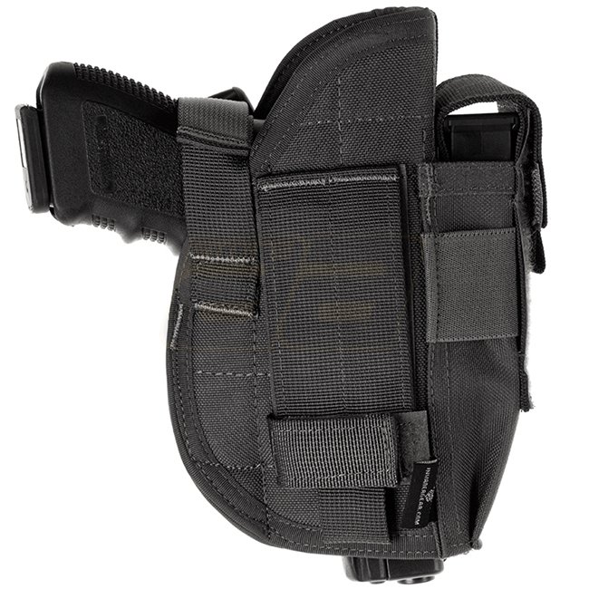 Universale Holster für mittelgroße Pistolen mit integrierter Magazintasche und verstellbarem Riemen für sicheres Tragen. Hergestellt aus strapazierfähigem 600D-Gewebe.