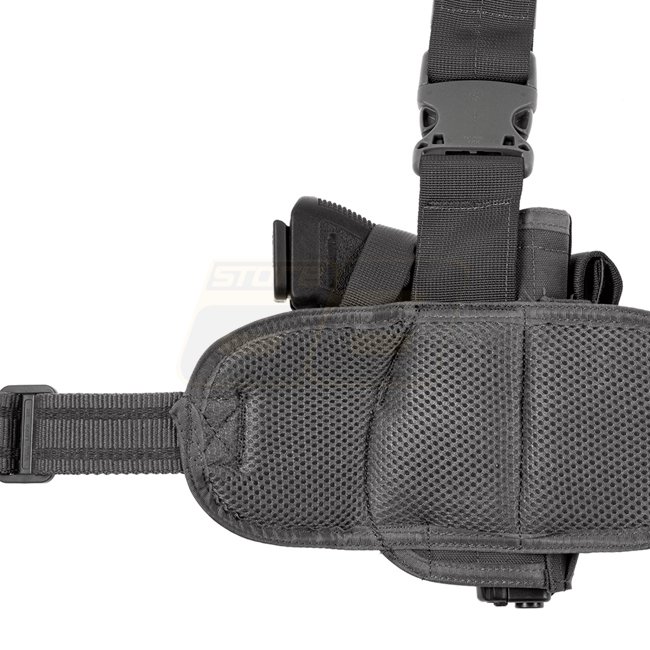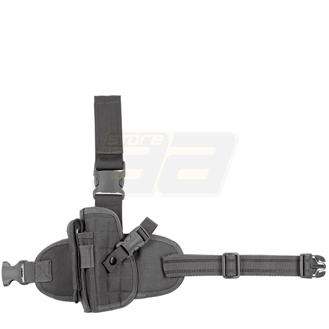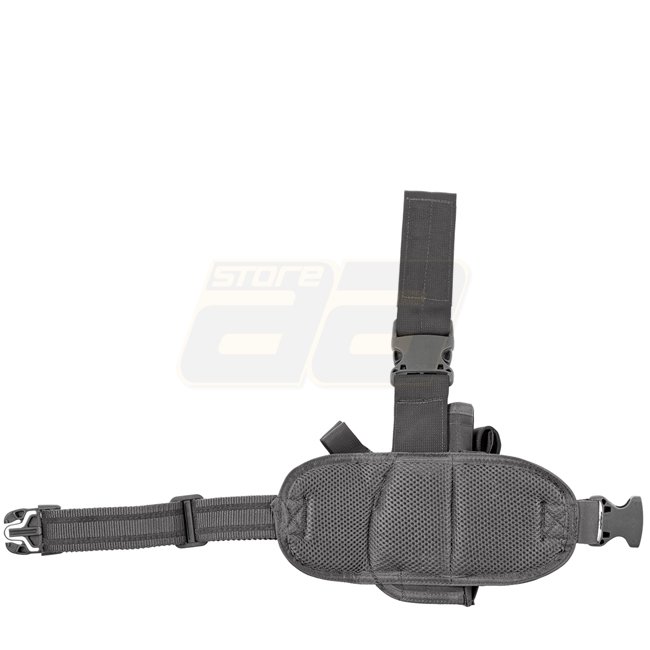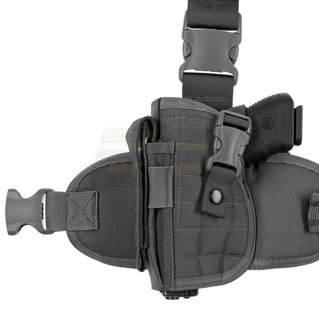 Universelles Dropleg-Holster, das für eine Vielzahl von mittelgrossen Pistolen wie z.B. Glock 17 oder Beretta 92 geeignet ist. Es ist mit einer integrierten Magazintasche und einer Beinplatte ausgestattet, welche mit einem Gürtelclip und drei rutschfesten elastischen Bändern am Oberschenkel befestigt wird.