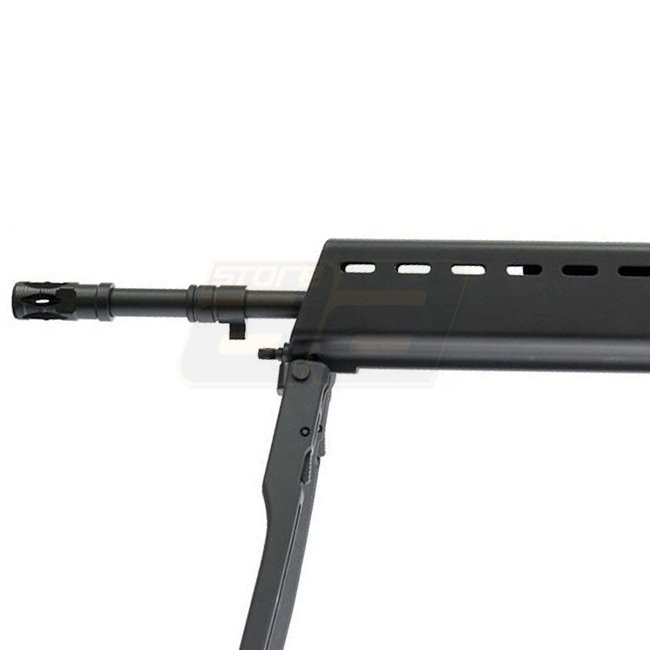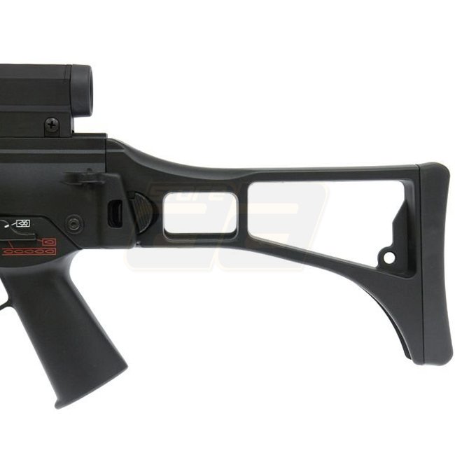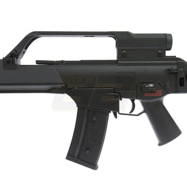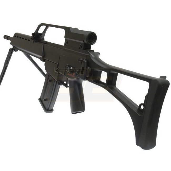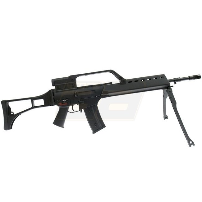Die Jing Gong G36 Serie hat sich bewährt, egal ob in der kompakten C Version, der kurzen K oder eben der E Version. Dies einerseits wegen der Langlebigkeit der mechanischen und elektrischen Teile die verbaut wurden sowie andererseits aufgrund des vergleichsweise niedrigen Preises. Im Set enthalten ist auch das verbaute Zielfernrohr sowie das am Handschutz anliegende Zweibein.