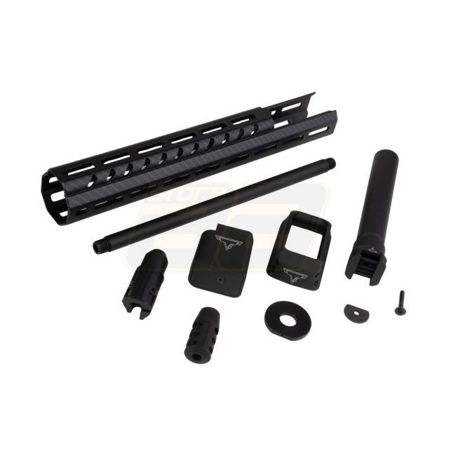 Dieses Conversion Kit bietet ein robustes und leichtes Polymer-Handguard mit einer Faux-Carbon-Optik und erweitertem M-LOK-System für die Montage verschiedener Zubehörteile. Es enthält außerdem einen Metall-Außenlauf mit 14mm CCW-Gewinde für den mitgelieferten TTI-Mündungsfeuerdämpfer oder andere Zubehörteile wie Tracer-Einheiten und Dummyschalldämpfer. Dank der Drop-in-Installation ist die Montage einfach und erfordert keine Modifikationen.