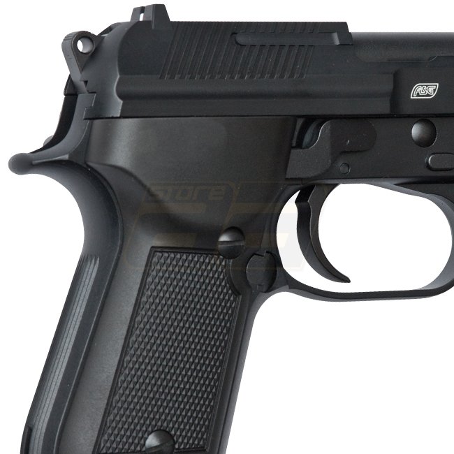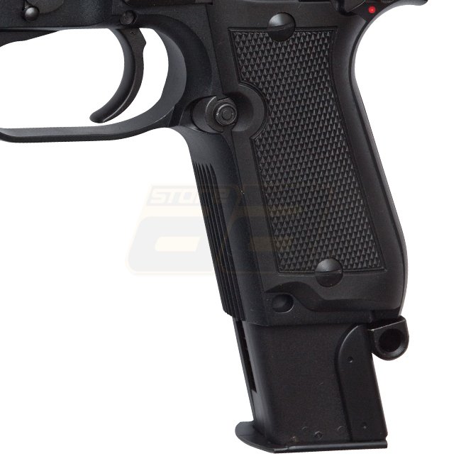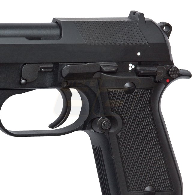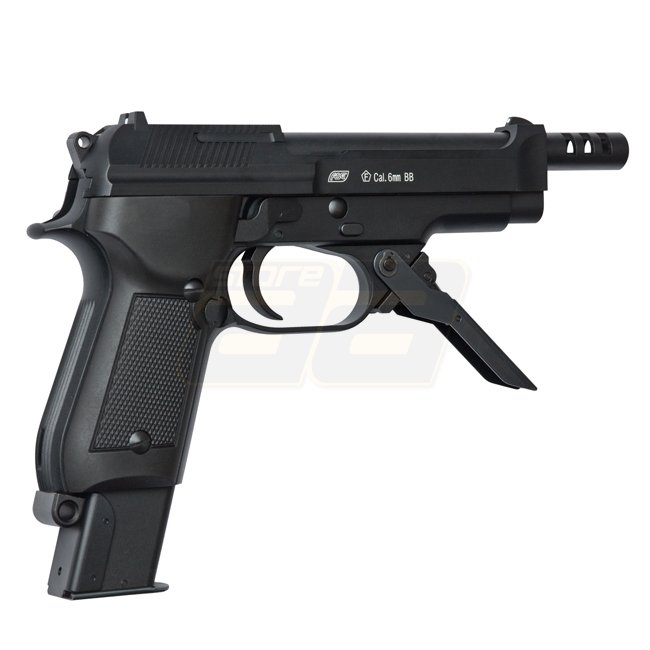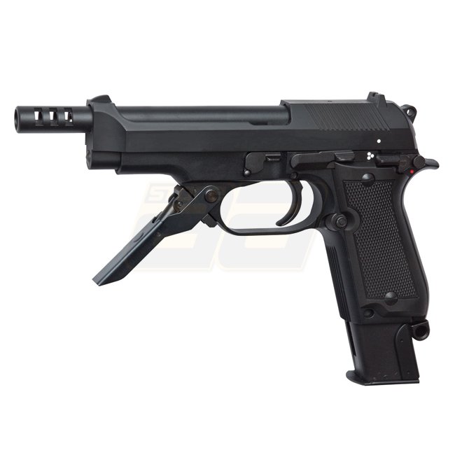 Abgesehen von der gewohnten KWA Qualität wartet die M93 mit einer speziellen, nicht all zu oft anzutreffenden Sonderfunktion auf: Neben dem üblichen Einzelschuss schiesst dieses Modell auch 3er Salven oder gar vollautomatisch, was die überdurchschnittliche Kapazität des mitgelieferten Magazins erklärt. Natürlich entleert sich dieses im vollautomatischen Modus dennoch innert Sekunden, was den Spass an diesem Modell markant erhöht. Für die nötige Kontrolle beim schnellen Schiessen sorgt ein ausklappbares Griffstück unter dem Lauf und der lang gezogene Aussenlauf mit Kompensator Aussparungen gibt der M93 ein sehr taktisches Aussehen was sie auch optisch stark von den regulären M9 Modellen abhebt.
