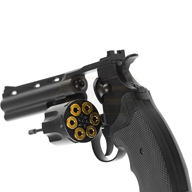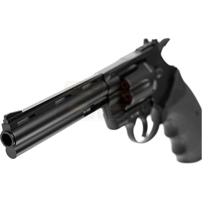 KWC Python 6 Zoll Co2-Revolver - Schwarz: Metall- und Kunststoffgriff, 6 mm Magazin, 288 mm Länge, 1100 g Gewicht, 140 mm Innengang, 510-530 FPS Geschwindigkeit, Halbmantel-Modus, 69,97-72,71 m Schussreichweite, Fester Hop-Up. Das Paket enthält die Waffe