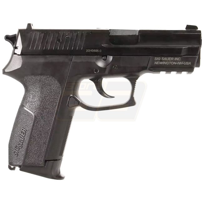 KWC SIG Sauer SP2022 H.P.A. Federpistole in Schwarz mit ABS-Kunststoff-/Metallkonstruktion, 24-Schuss-Magazin, 185 mm Länge, 320 g Gewicht, 230-250 FPS Geschwindigkeit, 31.55-34.30 m Schussreichweite und festem Hop-Up. Im Paket enthalten sind die Waffe un