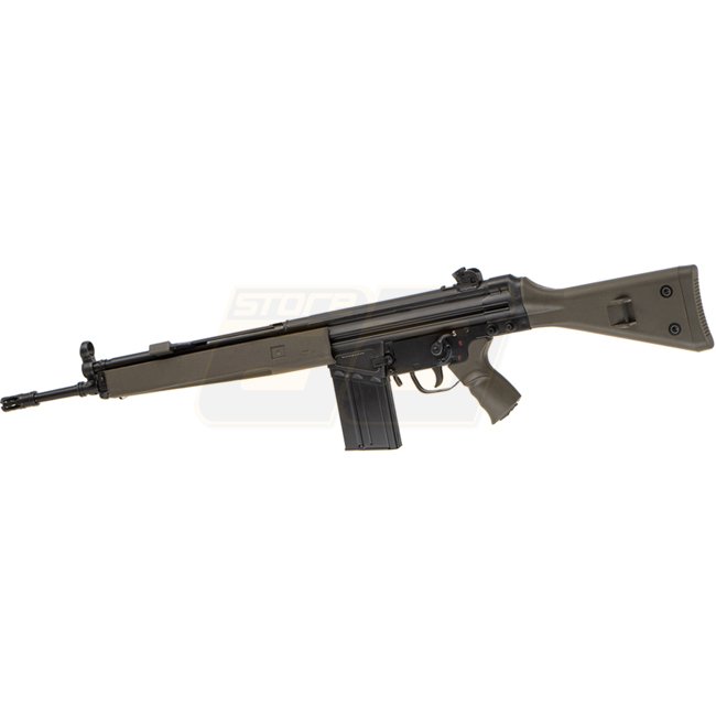 Hochwertiges LCT LC3A3-W S-AEG in Oliv, entworfen für den deutschen Markt. Halbautomatisch mit offizieller Genehmigung des Beschussamts. Metallkonstruktion mit Polymer-Schaft, Handschutz und Pistolengriff. Enthält Gearbox Version 3, 140-Runden Magazin, Sc