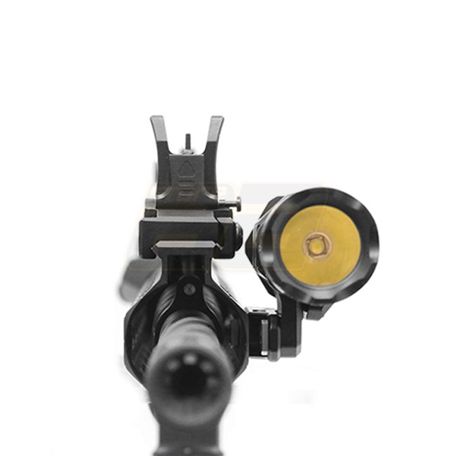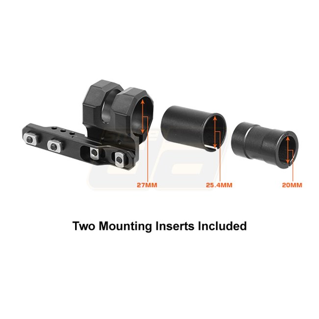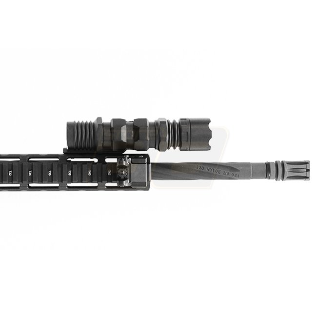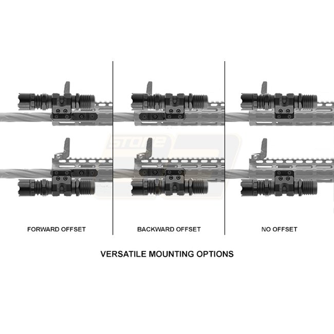 Leapers M-LOK Offset Taschenlampenringhalterung in Schwarz mit abnehmbarem Offset-Design und Polymer-Einsätzen für vielseitige Taschenlampenkompatibilität. Hergestellt aus strapazierfähigem 6061-T6 Aluminium, kompakt bei 88,1 x 52,3 x 33,3 mm und leicht m