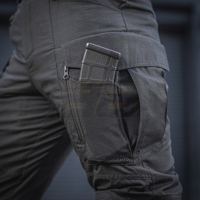 Die Cargotasche mit asymmetrischer Klappe ist mit einer zusätzlichen aufgesetzten Tasche ausgestattet, in die ein M4 oder AK-Magazin passen kann. Die Cargotasche selbst ist recht geräumig. Es hat zwei Falten, wodurch es für den Transport von sperrigen Gegenständen vergrößert werden kann. Darüber hinaus ist die Cargotasche mit einem zweiten Reißverschlusseingang ausgestattet, der den Zugriff auf den Inhalt aus sitzender Position ermöglicht. Der Boden der Cargotaschen hat ein Mesh für zusätzliche Belüftung.