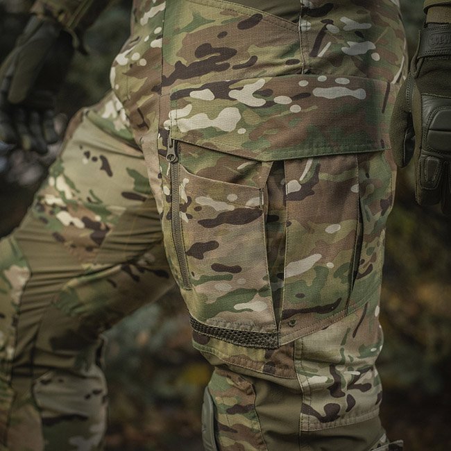 Die Hose ist mit einer großen Anzahl von Taschen ausgestattet, sowohl nützliche als auch besonder: Es gibt zehn davon. Die Hosenseitentaschen haben unten eine Verstärkung zum Anbringen eines Messer- oder Taschenlampenclips. Die Leistentaschen hinten schließen per Reißverschluss.