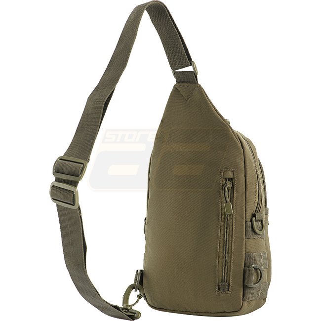 M-Tac Assistententasche in Ranger Grün - kompakter Einzelriemenrucksack mit verstellbarem Gurt für die linke oder rechte Hand. Vordere & seitliche MOLLE-Paneele für zusätzliche Ausrüstung. Material: 600D Polyester. Volumen: 4L. Gewicht: 330g. Maße: 28x16x