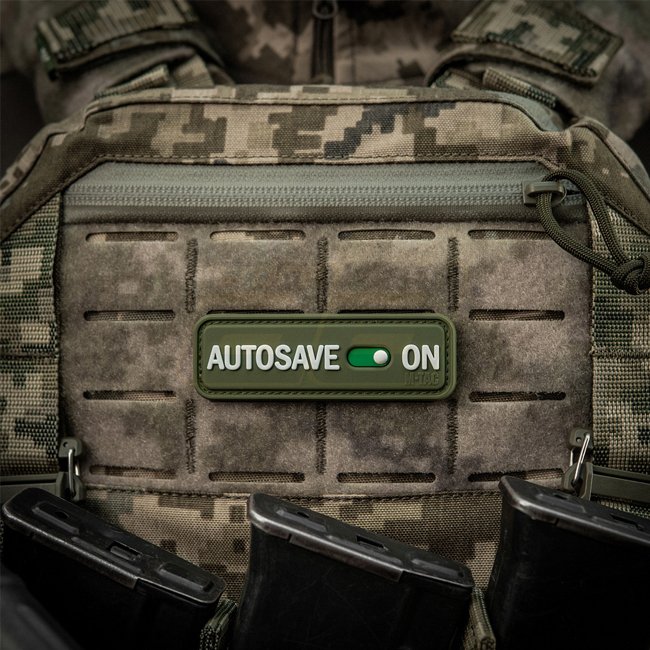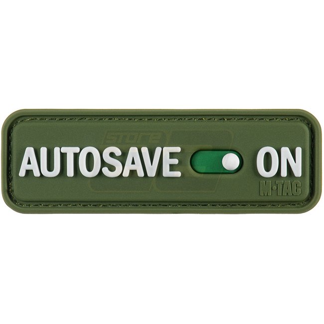 M-Tac Autosave Gummipatch - Olive. PVC-Vorderseite, Klettverschluss hinten, Abmessungen 80x25 mm.