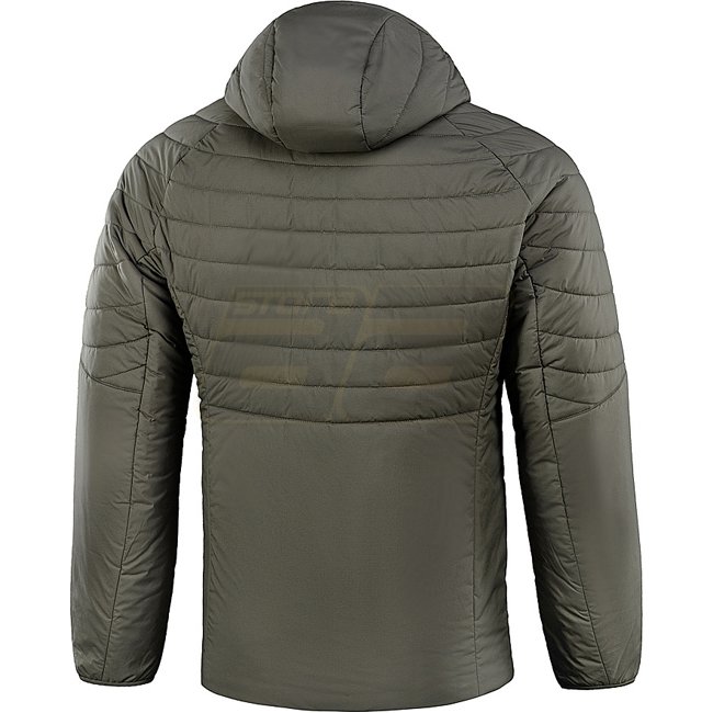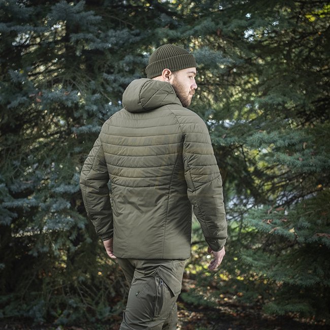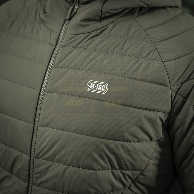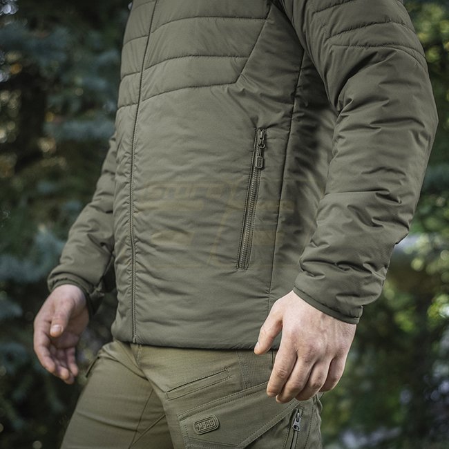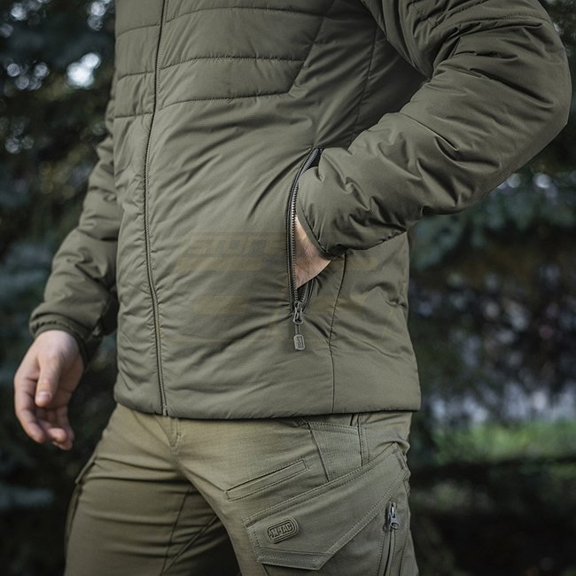 Aus leichtem, atmungsaktivem, wasserabweisendem Nylongewebe der japanischen Firma Toray. Die Jacke ist mit einer innovativen österreichischen G-Loft-Isolierung mit einer Dichte von 100 g / m2 isoliert, die hohe Wärmedämmeigenschaften aufweist und Feuchtigkeit bei Nässe leicht verdunstet. Außerdem kombiniert dieses Material auf organische Weise die Weichheit von Daunen und die Festigkeit von Kunstfasern.