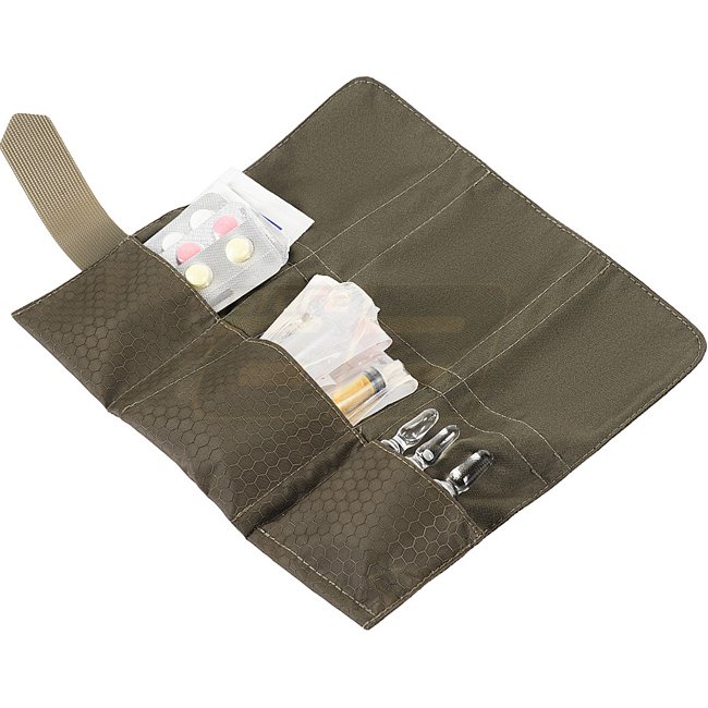 Hergestellt aus Hex Polyester, einem hochwertigen, strapazierfähigen und pflegeleichten Material. Schließt mit Klettverschluss. Es verfügt über drei Fächer zum Transportieren eines individuellen Erste Hilfe Sets: Tabletten, Pflaster, blutstillende Mittel, eine kleine Anzahl antiseptischer Verbände usw. Außerdem haben die Designer in einem Fach Gummibänder für Ampullen mit einem Volumen von 2ml und 5ml vorgesehen. Der abgebildete Inhalt ist nicht im Lieferumfang enthalten, die Tasche wird leer geliefert und muss auf die spezifischen Bedürfnisse des Benutzers konfiguriert werden.
