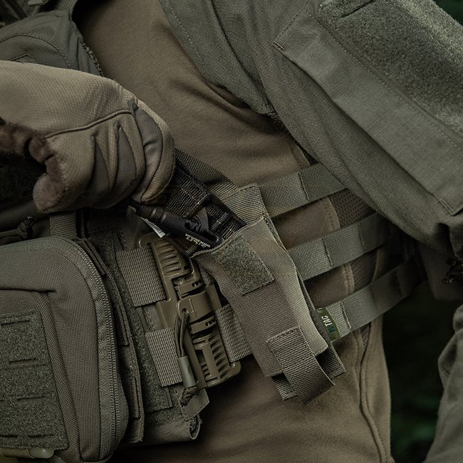 Die M-Tac Elastische Tourniquet-Tasche MOLLE Gen.II in Ranger Green hält sicher ein C-A-T-Tourniquet an Ausrüstung. Hergestellt aus strapazierfähigem Cordura 500D Material, leicht mit 40g.