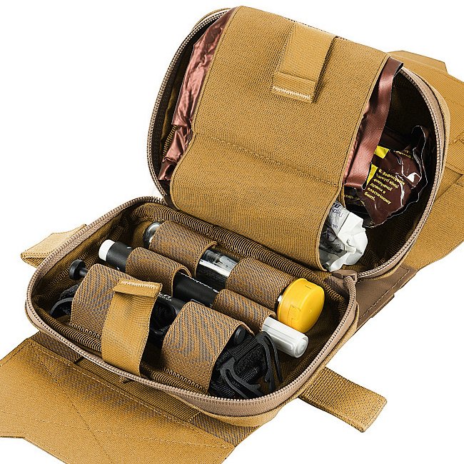 Die Basis des Kits besteht aus Cordura Laminat, geschnitten mit Laser Cut Technologie. Die Kennzeichnung des medizinischen Organisators erfolgt in zwei Farben – rot, traditionell für Erste-Hilfe-Sets, oder schwarz, um es weniger sichtbar zu machen. Wird ohne angezeigten Inhalt geliefert.
