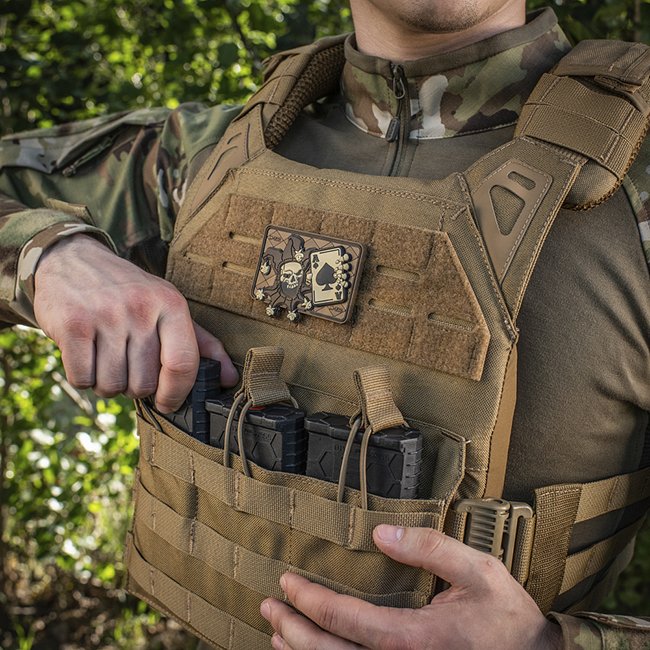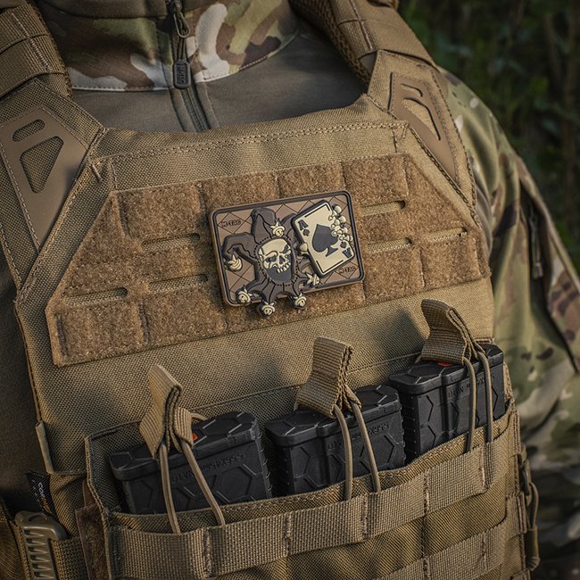 M-Tac Joker Skull 3D Gummipatch - Coyote, aus Gummi mit Hakenoberfläche, Abmessungen 78 x 55 mm.