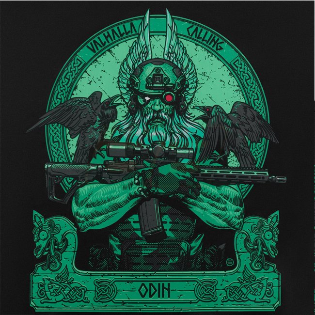 Der Aufdruck zeigt einen entschlossenen Odin, der seinen traditionellen Speer (Gungnir) gegen ein AR-15-Gewehr getauscht hat. Bekleidet mit moderner Kampfausrüstung und einem NVD-Helm ist er bereit, seine Krieger in die letzte Schlacht zu führen. Auf Odins Schultern sitzen seine treuen Begleiter - die Raben Hugin (Gedanken) und Munin (Gedächtnis), die jeden Tag die 9 Welten umfliegen und dem obersten Gott über alles berichten, was sich ereignet hat.