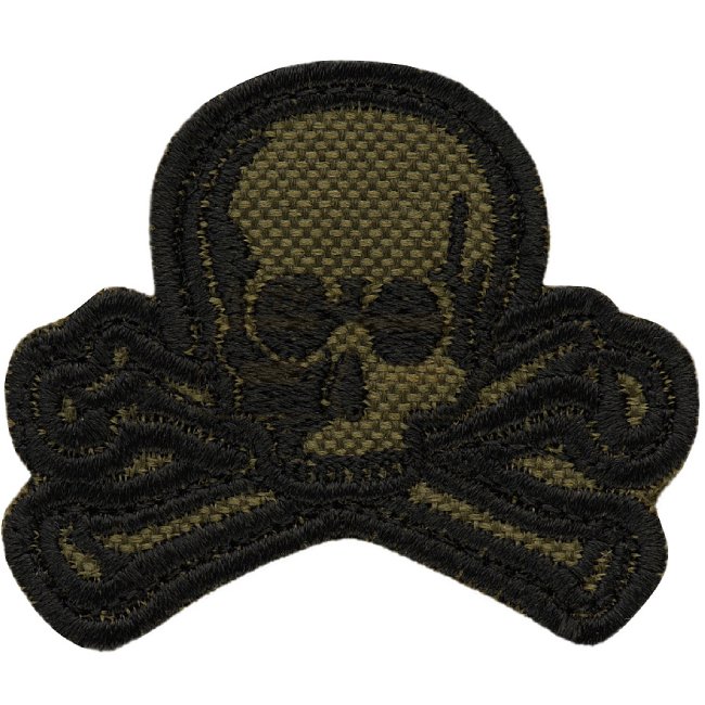 M-Tac Alter Schädel Stickerei-Patch in Olivfarbe. Vorderseite aus Textil, Rückseite mit Klettfläche. Maße 45mm x 55mm.