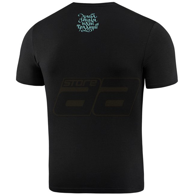 M-Tac Our Land T-Shirt in Schwarz ist ein Symbol für Mut und Tapferkeit und zeigt einen modernen Soldaten, eine Eule, die Weisheit symbolisiert, einen Wolf, der Loyalität, Stärke und Mut verkörpert, und antike Götter. Hergestellt aus hochwertigem 93% Baum