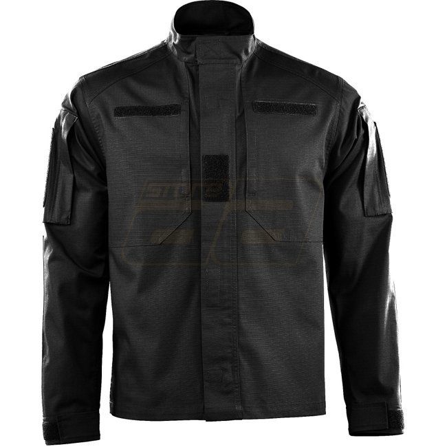 Die M-Tac Patrol Flex Jacke in Schwarz - S - Regular bietet einen bequemen, leicht angepassten Schnitt mit einem Stehkragen, Reißverschluss und versteckten Brusttaschen. Ideal für den taktischen Einsatz mit Funktionen wie Klettflächen für Abzeichen oder P