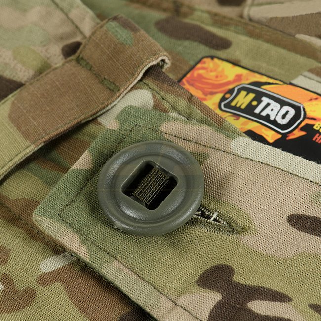 Der Gürtel der Hose ist mit Gurtbändern verstellbar und kann mit einem bis zu 5,5 cm breiten Gürtel getragen werden. An der Vorderseite befinden sich zwei D-Ringe zum Befestigen verschiedener Ausrüstungsgegenstände. Die Weite des Kniebereichs ist mit Hilfe von Klettverschluss verstellbar. Entlang der Unterkante der Hose ist eine elastische Kordel gespannt und Klettverschlüsse ermöglichen eine Größenregulierung.