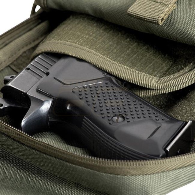 M-Tac Taktische Schultertasche Brust-Sling-Pack - Olive. Verdecktes Tragedesign mit verstellbarem Holster innen. Spezielle Schnellöffnungsriemen für Waffenzugriff. 5 Fächer für persönliche Gegenstände. 600D Polyester Material.