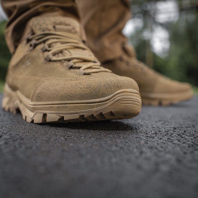 Die M-Tac Tactical Sneakers Patrol R Vent in Coyote-Farbe, Größe 42. Hochwertiges echtes Leder, synthetische Materialien, verstärkter Zehenbereich, stoßdämpfende Polyurethansohle und langlebige Gummisohlenschicht mit hohem Haftungskoeffizienten. Preiswert
