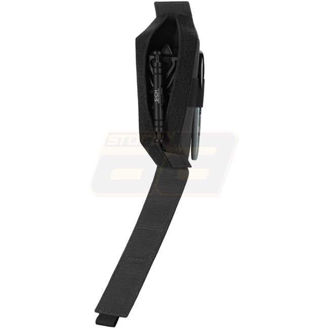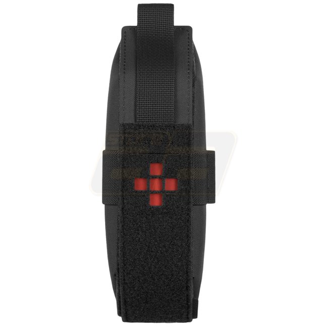 An der Unterseite der Öffnung wurde eine spezielle Klettlasche angebracht. Wenn die Lasche befestigt ist, kann die Tasche nicht vollständig geöffnet werden und das Tourniquet muss von oben herausgezogen werden. Wird die Lasche jedoch nach innen gestülpt, öffnet sich die Tasche vollständig, was die Entnahme des Inhalts vereinfacht.
