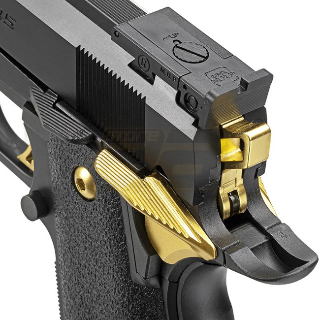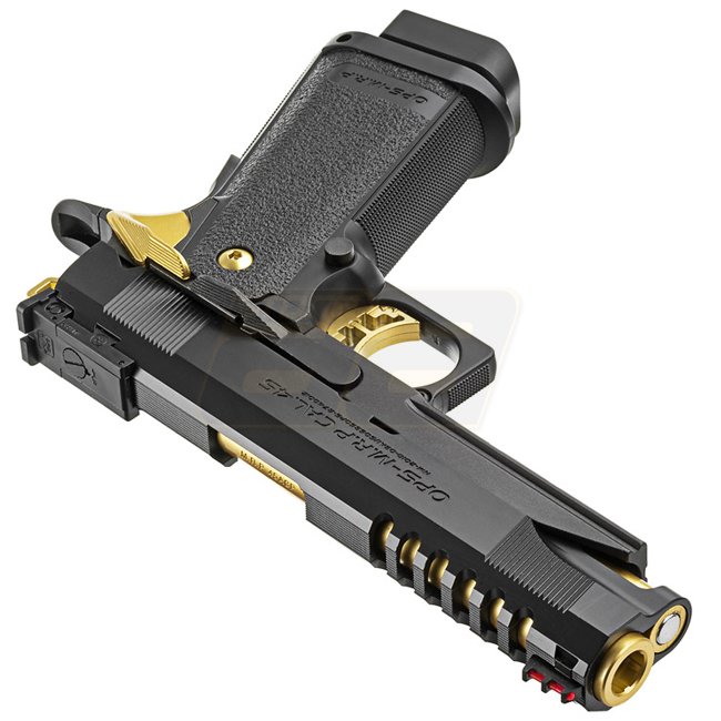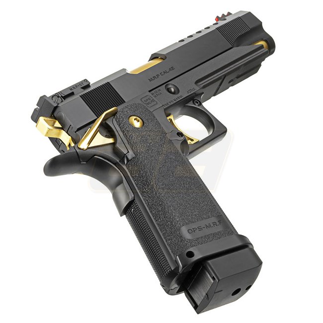 Die neue Hi-Capa 5.1 Gold Match von Marui ist speziell für Sportschützen gedacht welche Wert auf Qualität, Präzision sowie Geschwindigkeit legen. Der Schlitten wurde gegenüber den früheren Hi-Capa Modellen um einige Gramm erleichtert womit die Pistole schneller repetiert. Seitlich weist die Pistole die Gravur „OPS-M.R.P CAL.45“ auf. Zudem wurde ein Front-Kompensator und Leuchtabsehen für das Schiessen in der Dämmerung sowie im Dunkeln verbaut. Warum dieses Modell als Gold-Ausführung angepriesen wird ist schon auf den ersten Blick klar; Hammer, Abzug, Lauf und Sicherung sind in Gold gehalten und geben der Pistole ihr unverkennbares Äusseres. Der Rahmen der Waffe besteht aus Metall und unterhalb des Laufs ist eine 20mm RIS Schiene angebracht. Der texturierte Griff ist aus Nylon gefertigt, im Set wird zudem Grip Tape mitgeliefert welches für zusätzlichen Halt angebracht werden kann. Wie alle Marui GBB Modelle verfügt auch diese Pistole über einen verstellbaren Hop Up.