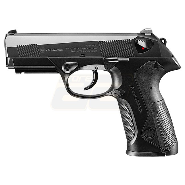 Die PX4 basiert auf den bekannten M9 Modellen, wobei nur noch Abzug und Sicherung annähernd daran zu erinnern vermögen. Absehen, Griffstück, Schlitten, Abzugsbügel – die gesamte Optik ist moderner geworden. Und wie bei modernen Pistolen üblich, kann das Griffstück durch austauschbare, im Lieferumfang enthaltene Ersatzgriffstücke an die meisten Handgrössen angepasst werden. Der Schlitten legt beim Schiessen nur einen kurzen weg zurück was eine schnelle Schussabfolge ermöglicht. Dies wird zusätzlich durch die leichte Kunststoff-Bauweise unterstützt, was gleichzeitig einen niedrigeren Gasverbrauch zulässt. Mit 25 Schuss ist die Kapazität des Magazins im guten Mittelfeld und die 20mm Schiene unter dem Lauf kann eine Vielzahl an unterschiedlichen Lampen aufnehmen. Wem die Optik der PX4 zusagt dem wird empfohlen diese äusserst kompakte Pistole in die engere Auswahl eingehen zu lassen.