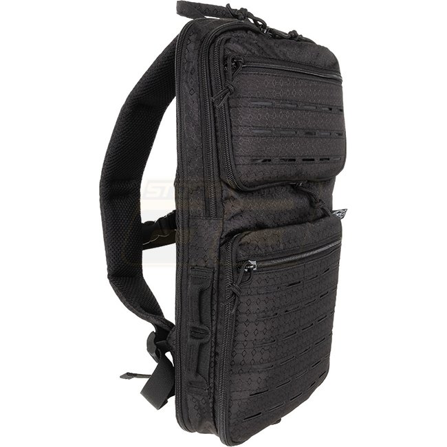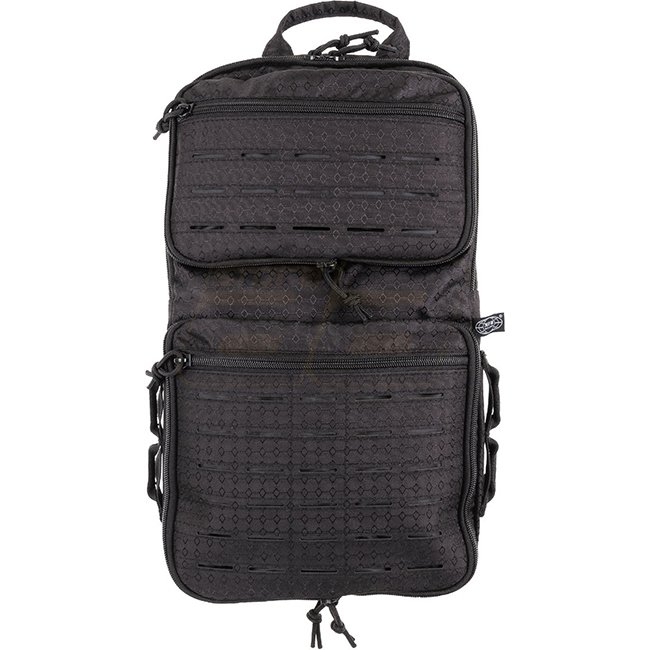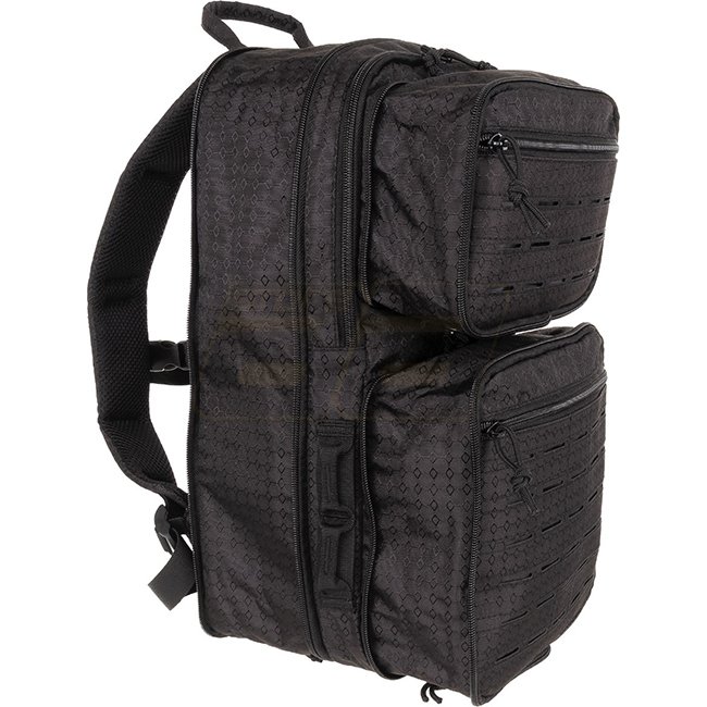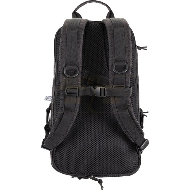 MFH Rucksack Compress OctaTac - Schwarz: Verstellbare, gepolsterte Schultergurte, D-Ringe, Brustgurt, atmungsaktives Netzpolster, mehrere Reißverschlusstaschen, Molle-Befestigungsschlaufen, Laserschnitt-Design. Kapazität: 7-15L. Abmessungen: 23 x 42 x 24