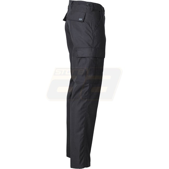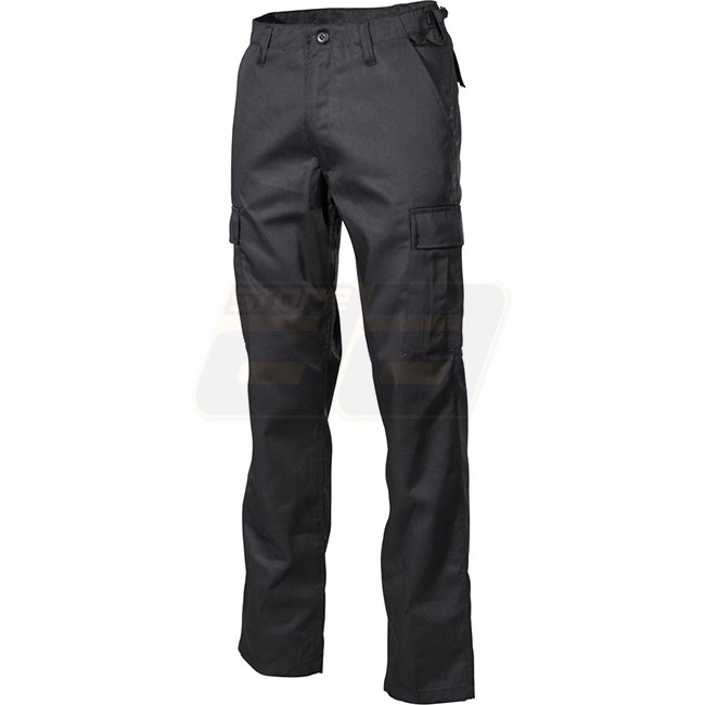 MFH BDU Kampfhosen in klassischer schwarzer Farbe. Mit einem Frontreißverschluss, 6 geräumigen Taschen, verstellbarem Taillenbund, extra breiten Gürtelschlaufen und einem Kordelzug am unteren Saum. Hergestellt aus 65% Polyester und 35% Baumwollmischung. P
