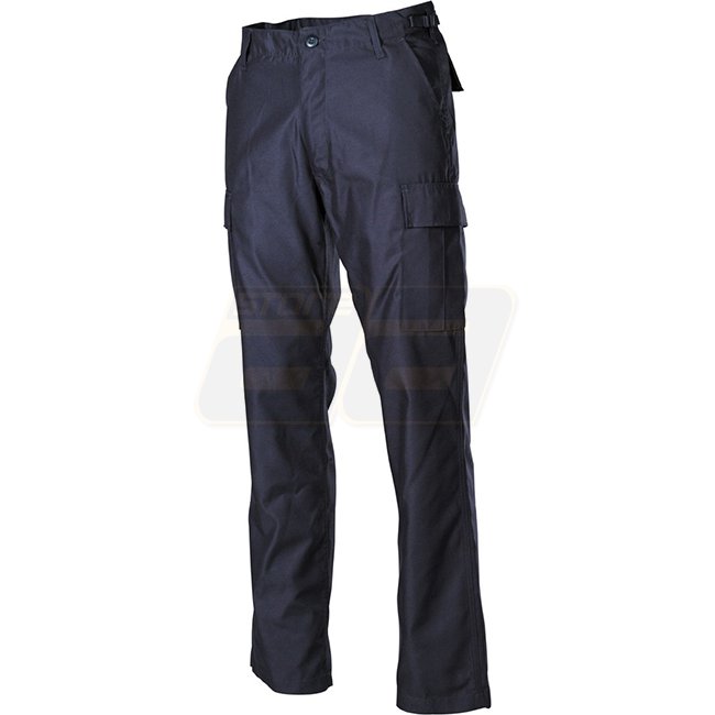 MFH BDU Kampfhose in Blau - S. Klassischer US ARMY Stil mit Frontreißverschluss, mehreren Taschen, verstellbarem Bund und Kordelzugsaum. Hergestellt aus einem 65% Polyester, 35% Baumwolle Mischgewebe.