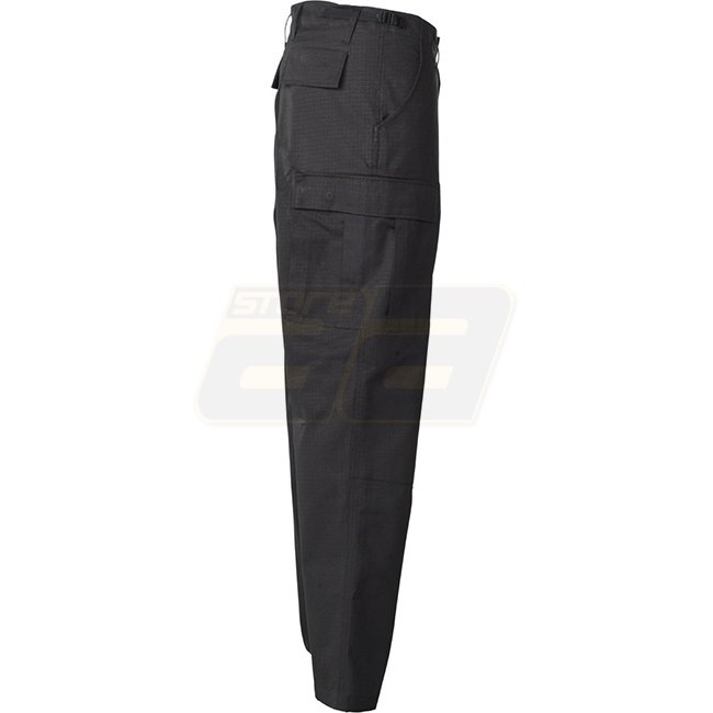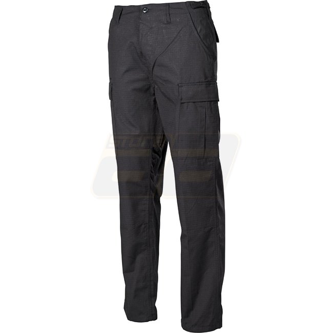 MFH BDU Kampf Hose in Schwarz - S. Klassischer US-Armee-Stil mit Ripstop-Gewebe. Merkmale sind der Knopfverschluss, mehrere Taschen, verstellbarer Bund, verstärkte Knie und Sitz. 100 % Baumwolle. Perfekt für den taktischen Einsatz.