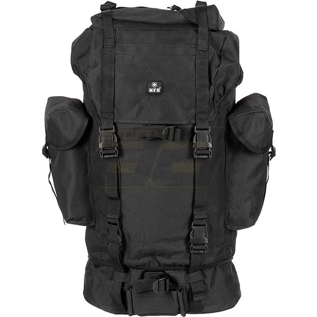 MFH Kampfrucksack 65 l - Schwarz: Verstellbare, gepolsterte Schultergurte, Hüftgurt mit Klickverschluss, oberer Tragegriff, Klettfläche, mehrere Taschen, Hauptfach mit teilbarem Bodenteil, Außenreißverschluss, Innenfächer, Aluminiumstabilität r