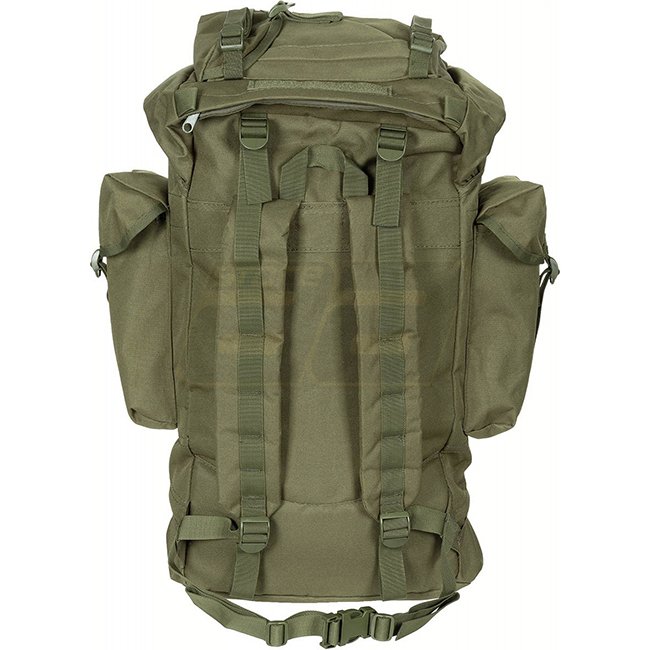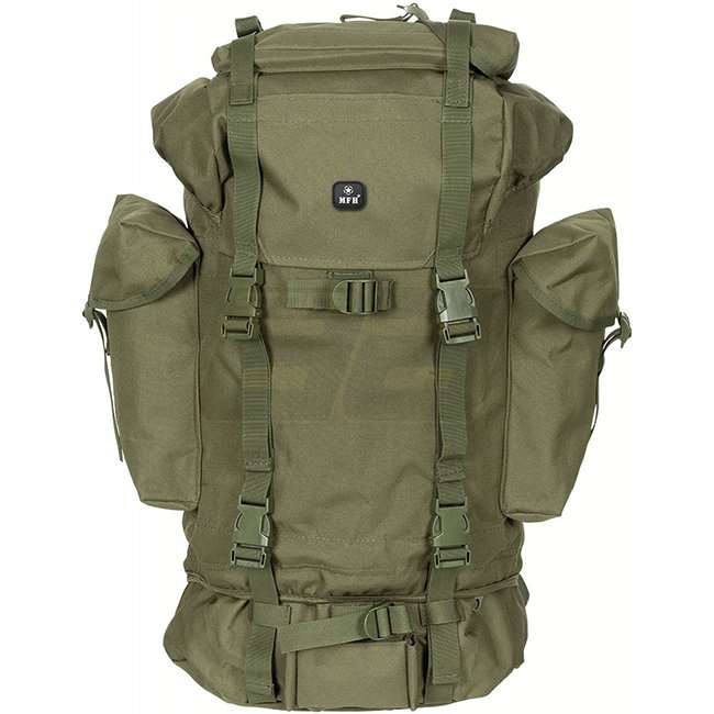 MFH Kampfrucksack 65 l - Olive - Verstellbare, gepolsterte Träger, Hüftgurt, mehrere Fächer, verschiedene Taschen, robustes Polyester-Material.