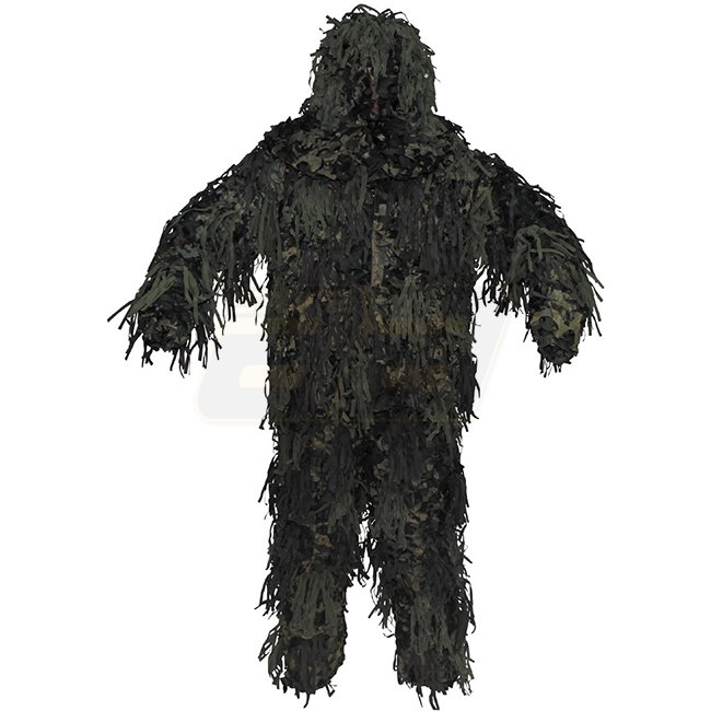 MFH Ghillie Tarnanzug Jackal - Wald - M/L: 3-teiliges wasserdichtes Streifen-Tarnanzug mit Jacke, Hose und Kopfbedeckung für ultimativen Tarnung während Outdoor-Aktivitäten. Merkmale umfassen eine vordere Knopflochleiste, abnehmbare Kapuze, elastische Kor
