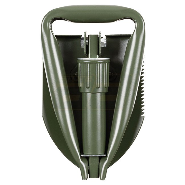 Extra kompakte faltbare Schaufel für den Einsatz im Freien - MFH Mini-Faltspaten in Oliv. Robuster Stahlgriff und -blatt, kann auch als Hacke verwendet werden. Gezahnte Kante am Blatt, faltbar mit Schraubverschluss für einfache Aufbewahrung. Wird mit eine