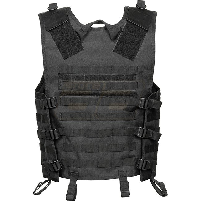 MFH MOLLE Weste Light - Schwarz: Taktische Weste mit modularem System, strapazierfähiger Reißverschluss mit Clipverschluss, an der Schulter verstellbar, Molle-Schlaufen, Klettflächen, Rettungsgriff, 6 Gürtelschlaufen, 3 Innentaschen. 100% Polyester.