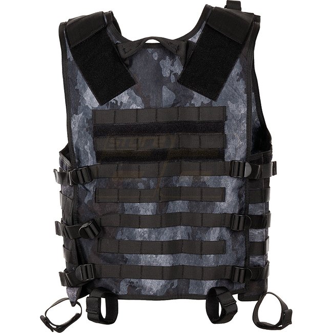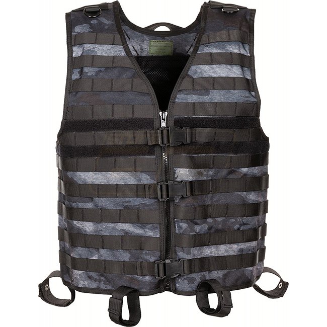Taktische Weste mit modularem System, höhenverstellbar an der Schulter, Molle-Befestigungsschlaufen, Klettverschluss-Paneele, Rettungsgriff, 6 Schlaufen am Hüftband, 3 Netz-Taschen. 100% Polyester.