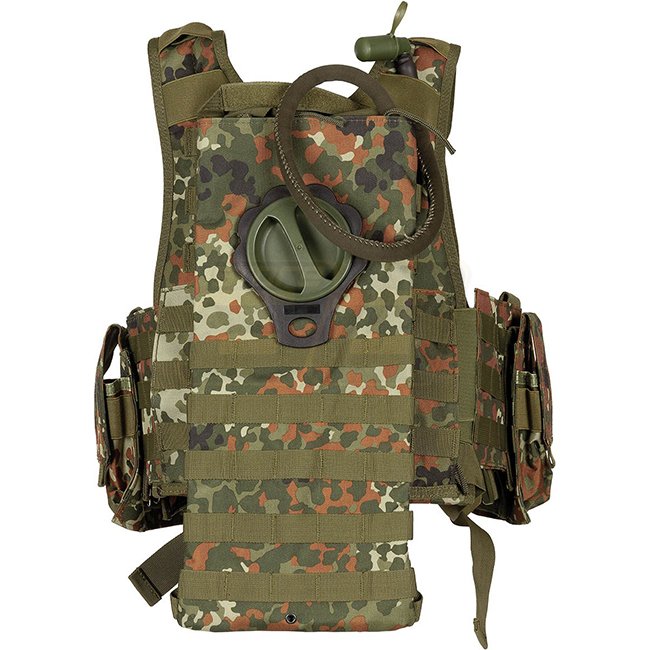 Taktische Weste mit integriertem Hydratationssystem und verstellbarem Sitz, ausgestattet mit verschiedenen Munitionstaschen und abnehmbaren Komponenten für vielseitige Nutzung. Hergestellt aus 100 % Polyester. Das Molle-Schlaufen-System bietet zusätzliche