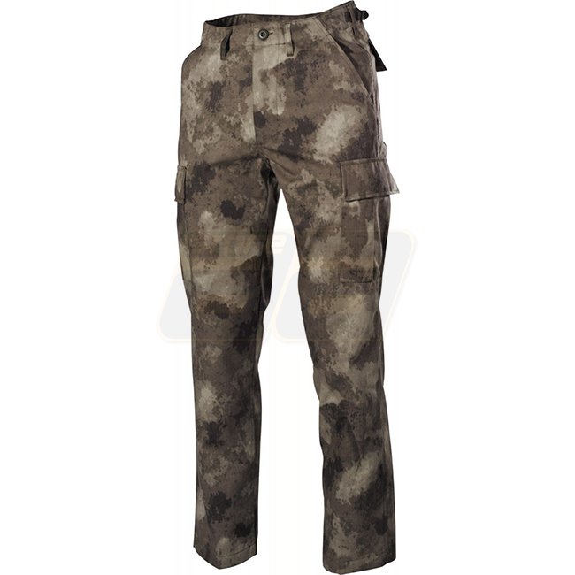MFH US Kampf-Hosen - HDT Tarnmuster - L: Klassische US ARMY Hosen mit einem Frontreißverschluss, 2 Hosentaschen, 2 Seitentaschen, 2 Beintaschen, verstellbarem Bund und besonders breiten Gürtelschlaufen. Hergestellt aus 65% Polyester und 35% Baumwolle.