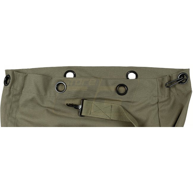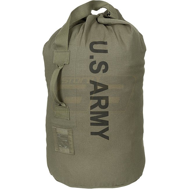 MFH US Duffle Bag in Olivfarbe. 100% Baumwollmaterial, 100L Kapazität, 40 cm im Durchmesser, 80 cm Höhe und wiegt 820g. Ausgestattet mit 1 Trageriemen mit Karabiner, verstärktem Griff und ID-Fenster.