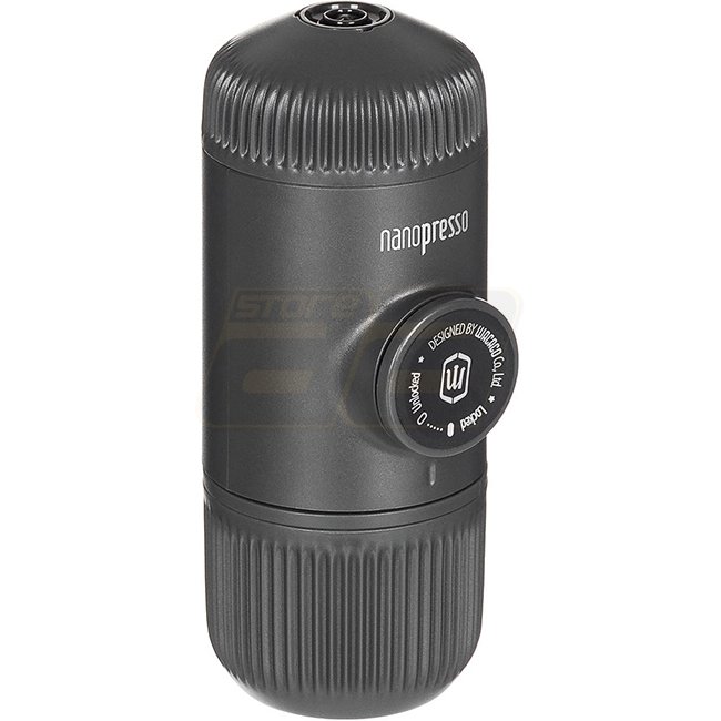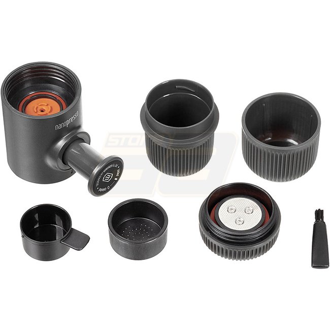 NanoPresso Espressomaschine - Grau: Tragbare Espressomaschine, manuelle Bedienung, kompaktes Design, einfach zu bedienen und zu reinigen. Enthält Wassertank, Pumpe, Siebträger, Filtersieb, Löffel und Reinigungsbürste. Abmessungen: 16 x 7 cm, Gewicht: 340