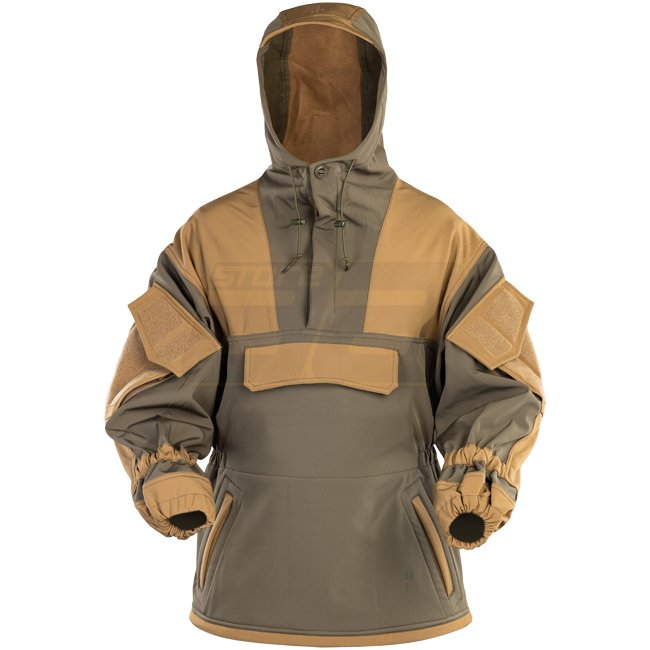Die große Kapuze ist in Höhe und Umfang verstellbar. Große, robuste geschlitzte Knöpfe auf der Vorderseite ermöglichen das Schließen und Öffnen des AKROG auch mit Handschuhen. Die zwei Haken & Flausch Flächen auf den Oberarmen sind vertikal getrennt, wodurch das Flauschmaterial ergonomisch um den Oberarm gelegt werden kann.